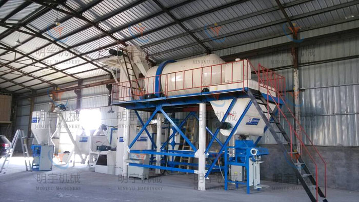 該生產線為雙配套生產設備,即砂漿混合及?;⒅榛旌?。其中,砂漿混合采用臥式無重力攪拌機,混合水泥、沙子、添加劑等,具有混合時間短、均勻度高的優點。無軸滾筒式玻化微珠專用混合機,內部機構設計獨特,能保證物料在原始狀態下均勻混合,同時將破損率降低。該配套設備是目前生產單組份無機保溫砂漿較為科學合理的生產模式。